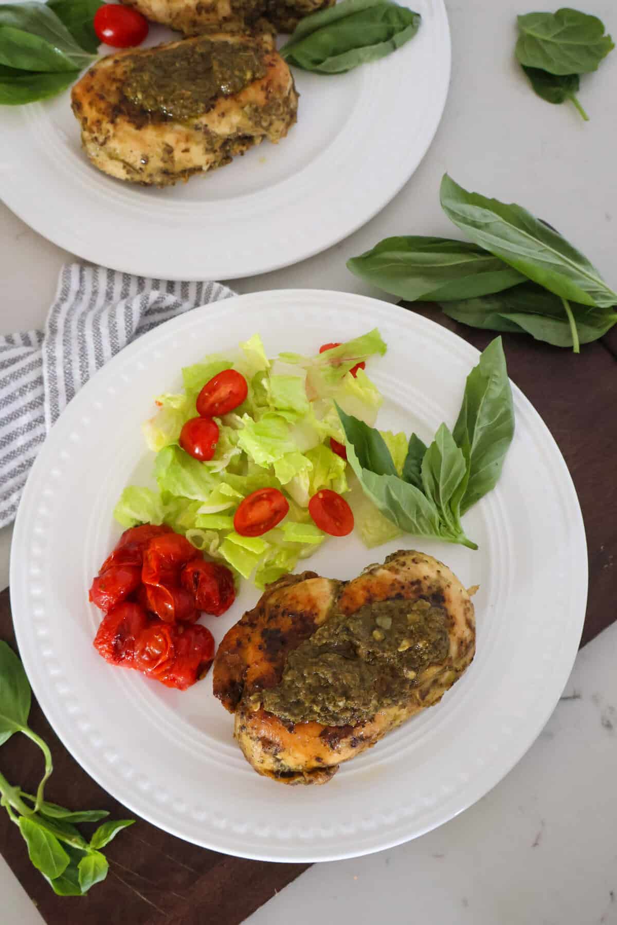 - Place the chicken breast onto a clean plate and add the remaining pesto on top of each one. I like to serve mine with a fresh salad and grilled tomatoes, however, this goes great with a lemon butter pasta as well.